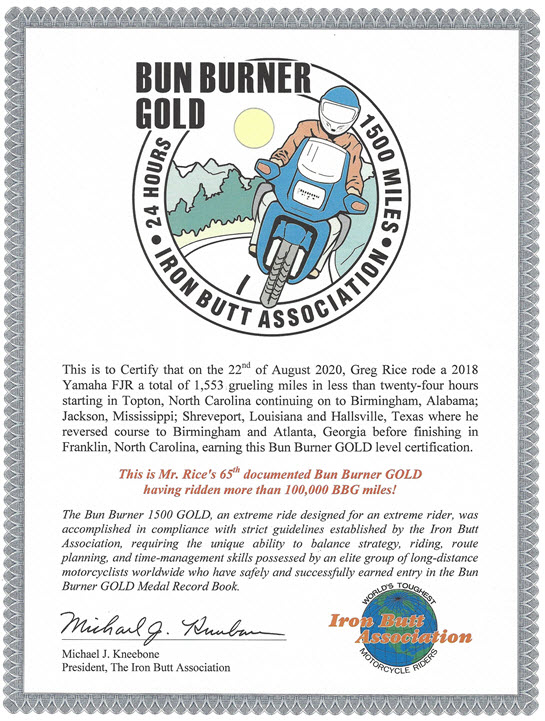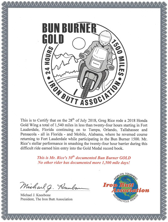 I successfully completed my 50th Iron Butt Association Bun Burner Gold ride July 28, 2018. I am the first person to complete 50 or more BBG's.