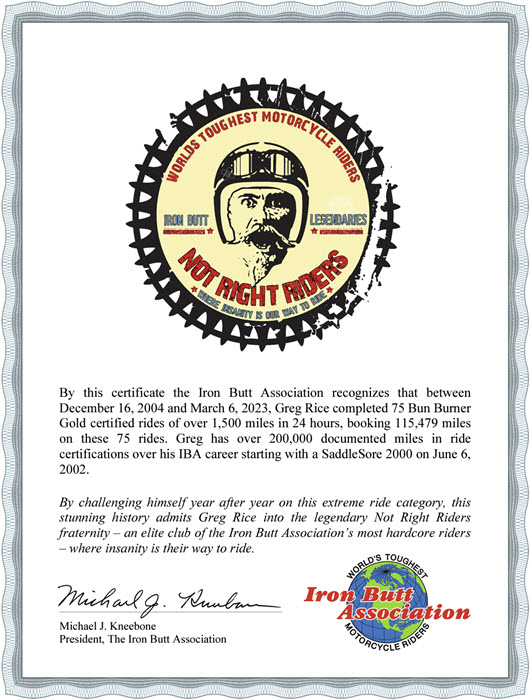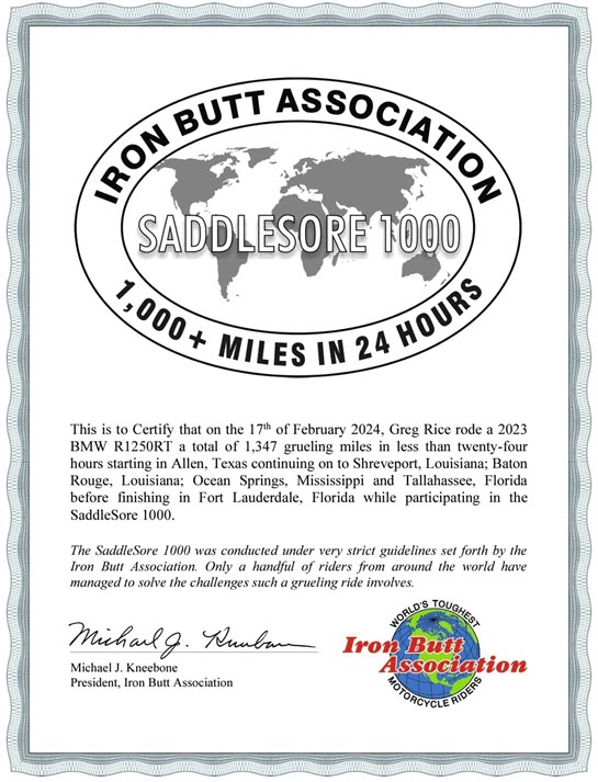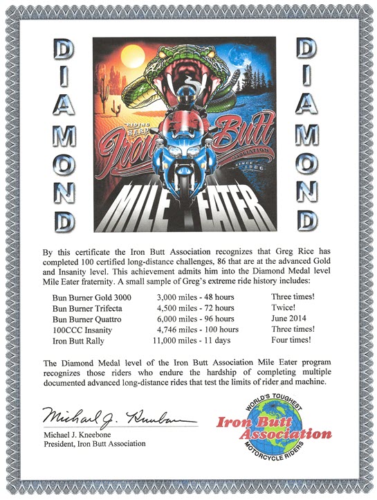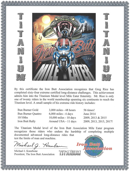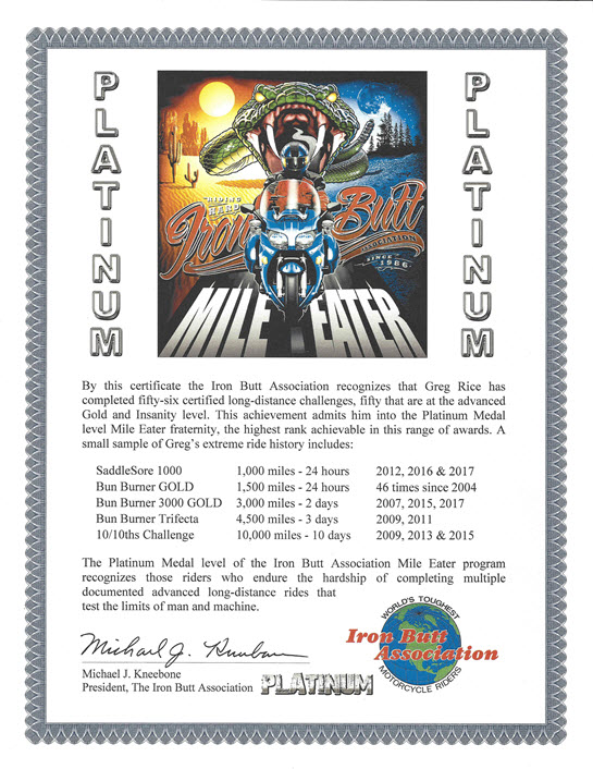 I received a Iron Butt Association Platinum Mile Eater certificate at the 2018 annual IBA party at Jacksonville. I have ridden over 130,000 miles of IBA certified rides.