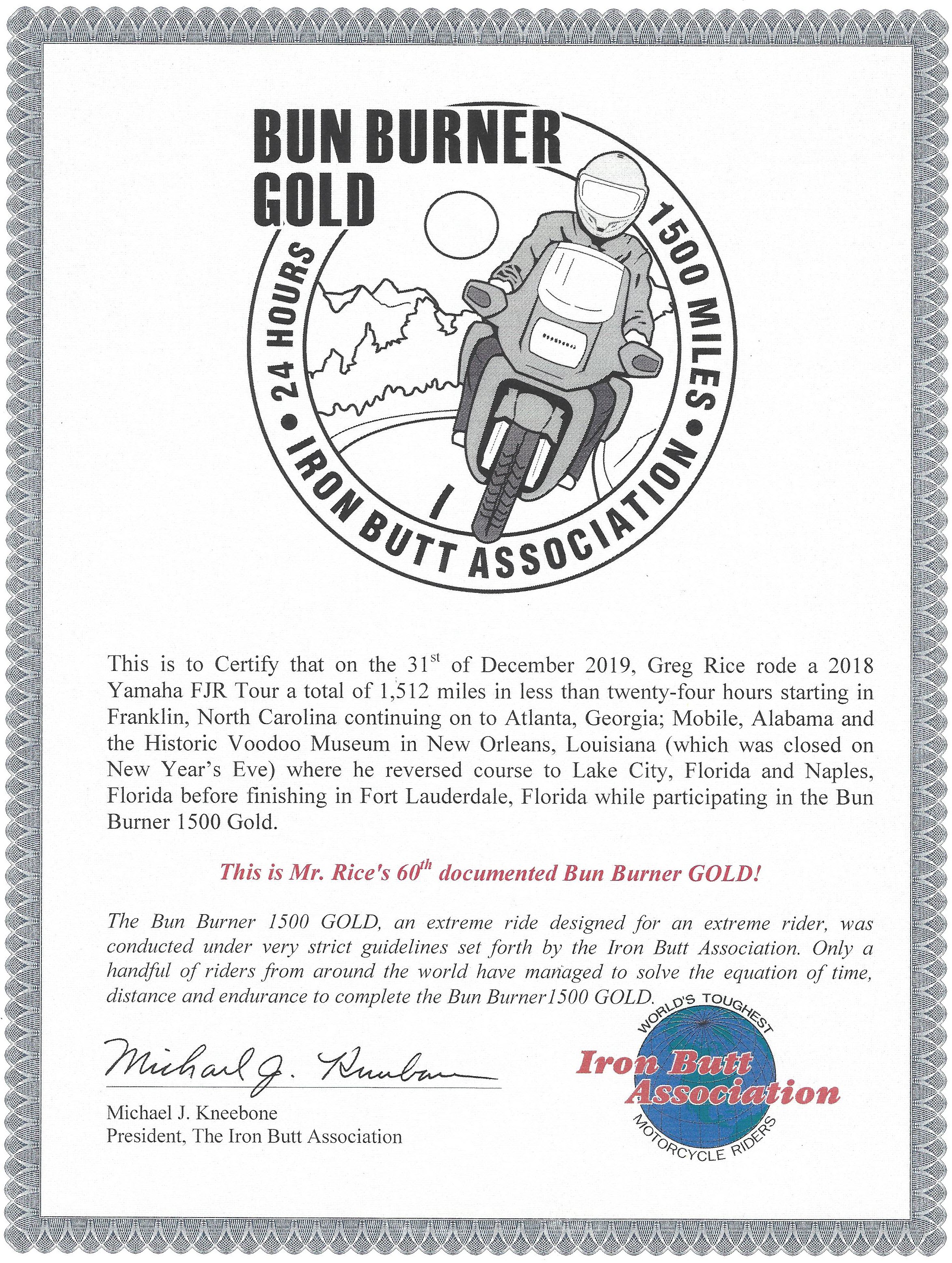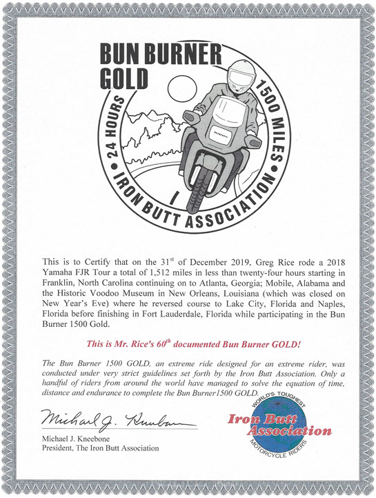 I received my IBA certificate for my 60th BBG ( Bun Burner Gold ) ride I did on New Years Eve, December 31, 2019, to the Voodoo Museum in the French Quarter in New Orleans. It was a tough ride as the crowds in the Bourbon Street area were crazy!