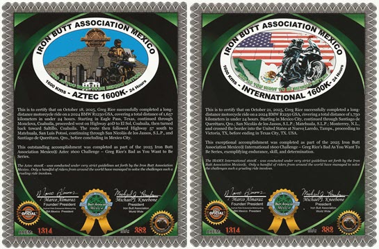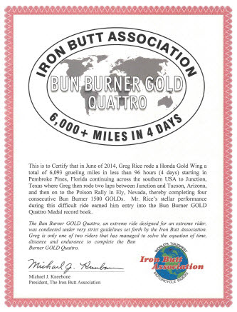 This is my certificate from the Iron Butt Association for my Bun Burner Gold Quattro ride. I received this certificate on my birthday. It was a nice present to receive.