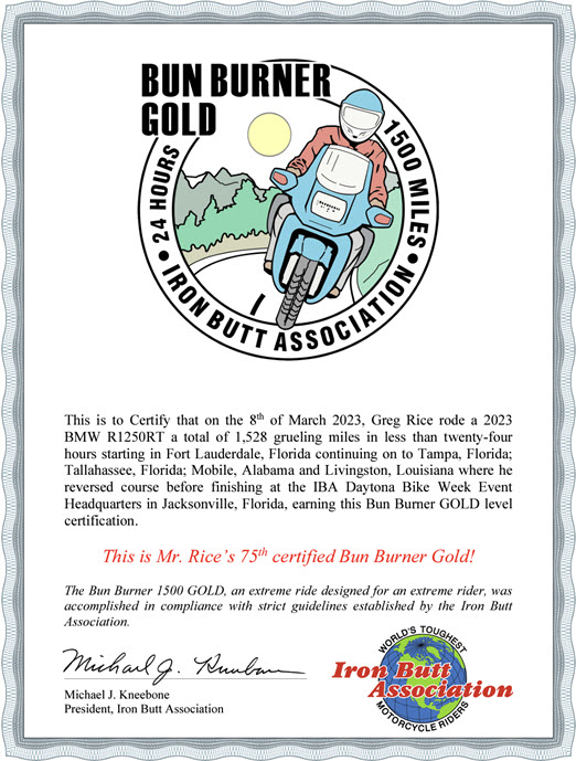 I just completed my 75th Bun Burner Gold ( BBG ) that put me over 115,000 miles riding BBG's. I also went over 215,000 total IBA miles! This ride was 1,528 miles and I endded up at the 2023 IBA JAX Party.