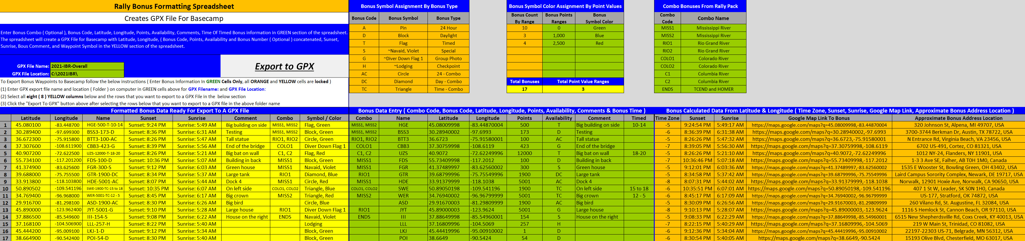 One of the tools is to build a GPX file of bonus information from the file that is provided by the rally master at the start banquet of a rally. This tool builds the GPX file that has all of the bonus information that I like to see in my mapping software ( now Basecamp ). I designed this for how I like to create my bonus names and to also provide me some additional information ( including sunrise and sunset of the bonus ) about the bonus that helps me when planning my route.