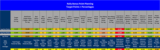 Below is another screen shots of spreadsheet tool I use to identify how many points I should target from bonuses in a leg based on target point information provided by the rally master. Usually in the IBR we are given a target number of points for a particular leg. Click on the image for a full size version.