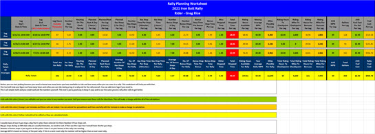 Below is screen shots of another tool I use to identify how many riding hours I have in a rally along with how many miles I should plan for when creating my routes. The spreadsheet takes into account all of the know reasons I would be stopping during a rally while on the clock and then I subtract that time from the known leg hours to arrive at how many riding hours I have in the leg. I then calculate the possible miles by using a moving average speed for that leg. It could be different each leg based on the part of the country I will be riding in. I then try and builds routes that have approximately the same number of miles in my spreadsheet. Click on the image for a full size version.